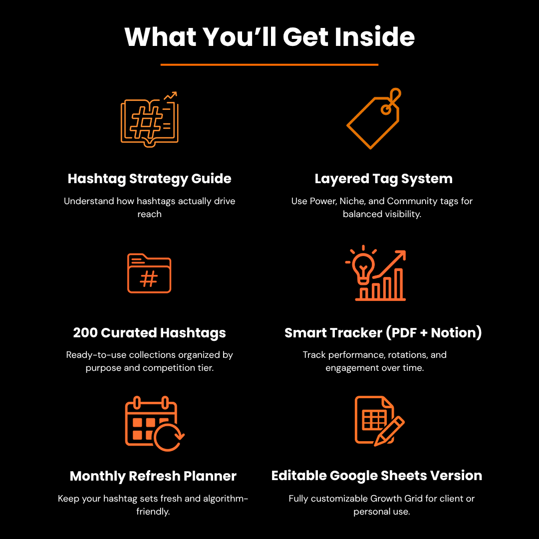 - The Growth Grid System™ — your step-by-step method for stacking hashtags strategically