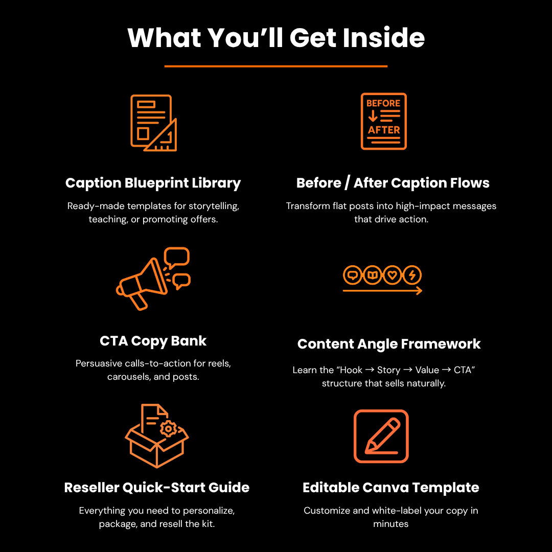 The Captivator Kit™ gives you proven caption frameworks, plug-and-post templates, and ready-to-brand writing prompts so your content connects — and your sales stack up.
